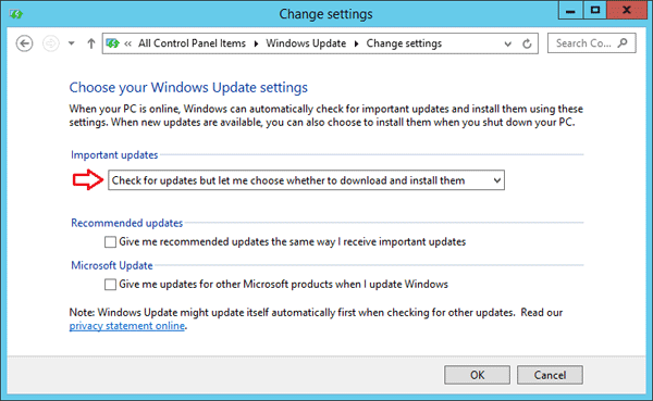 - 在重要更新下,選中“檢查更新,但讓我選擇是否下載並安裝它們從下拉菜單中選擇“選項”。單擊“確定”。