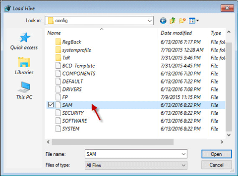 第 7 步:在加載蜂巢對話框,選擇這台電腦,然後打開安裝 Windows 10 系統的磁盤驅動器,並導航到Windows系統32配置。下配置文件夾,雙擊薩姆文件來創建新密鑰。