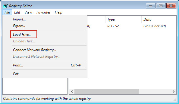 第 6 步:在註冊表編輯器,點擊HKEY_LOCAL_MACHINE,然後單擊文件選項卡並選擇加載蜂巢。