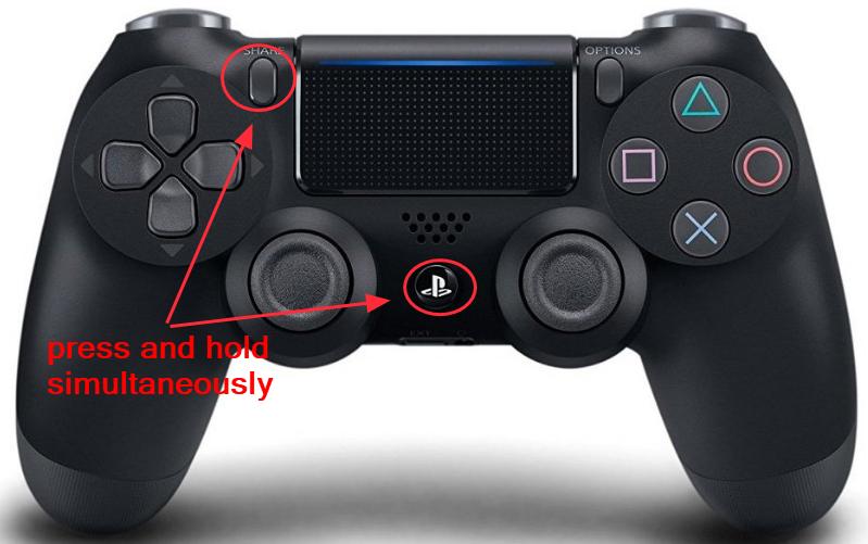 步驟1:按住PS按鈕和共享按鈕同時約7秒。這將使控制器進入配對模式。