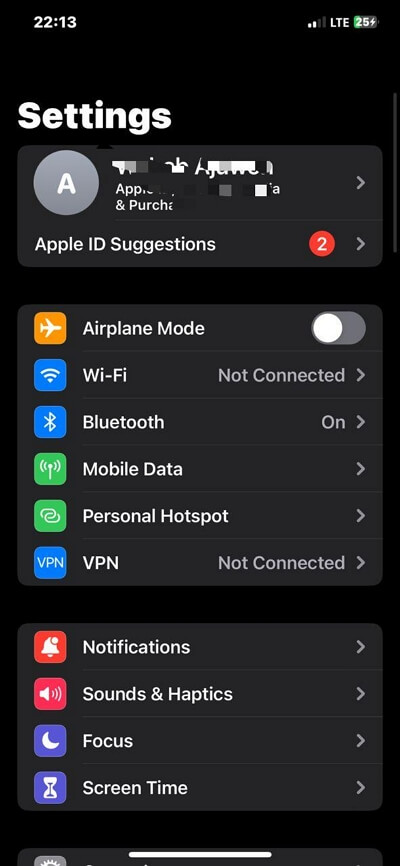 步驟一:打開 iPhone 上的“設置”應用程序,然後點擊屏幕頂部的您的名字。