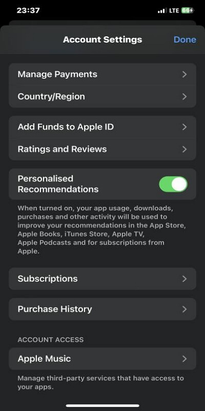 您是否有任何與您的 Apple ID 相關的未完成或未付款的訂閱購買項目?如果是,那麼這可能就是問題的原因。確保您已結清所有未付費用以恢復您的帳戶。