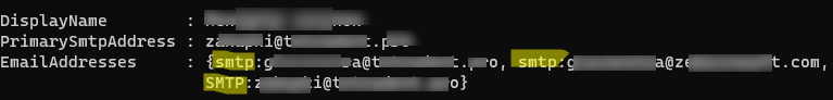 如您所見,為用戶分配了多個附加 SMTP 地址,這些地址存儲在 EmailAddresses 字符串屬性中。此屬性中可能還有其他類型的地址,因此要獲取郵箱的所有 SMTP 地址的列表,請運行以下命令: