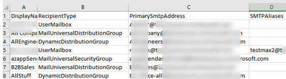 Get-Recipient -ResultSize Unlimited | Select-Object DisplayName, RecipientType, PrimarySmtpAddress, @{Name="SMTPAliases";Expression={($_.EmailAddresses | Where-Object { $_ -match "^smtp:" } | ForEach-Object {$_ -replace "smtp:",""}) -join "," }}