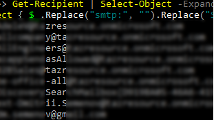Get-Recipient | Select-Object -ExpandProperty EmailAddresses | Where-Object { $_ -match "^smtp:" } | ForEach-Object { $_.Replace("smtp:", "").Replace("SMTP:", "") }
