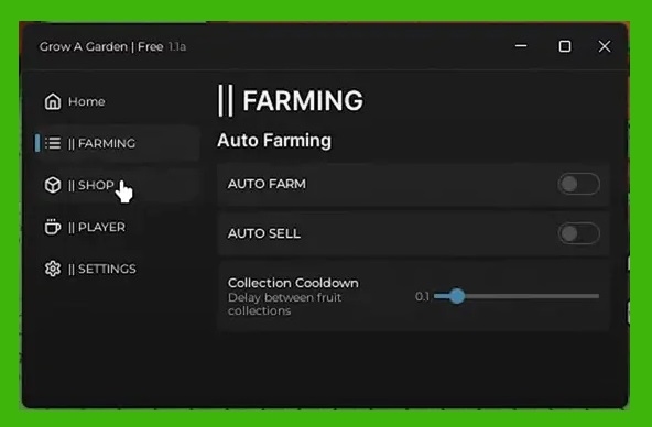 特徵:主選項卡、種子選項卡框、選擇種子、自動購買所選種子、裝備選項卡、選擇裝備、自動購買所選裝備、雞蛋選項卡框、選擇雞蛋、自動購買所選雞蛋、自動孵化寵物蛋、事件選項卡、選擇蜜蜂商店物品、自動購買蜜蜂商店物品