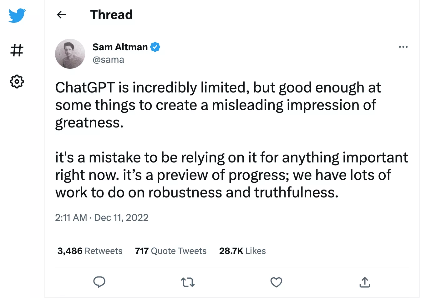 然而,許多人反映 ChatGPT 仍然不可靠且缺乏能力,特別是在處理嚴重事務時。 ChatGPT 背後的首席執行官 Sam Altman 特別警告說,這種人工智能驅動的解決方案“極其有限”,不適合任何真正重要的事情,至少目前是這樣。