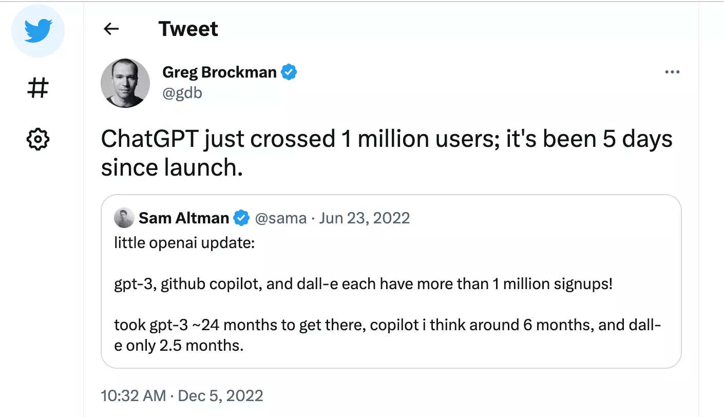 顯然,ChatGPT 正在取得巨大的成功。 2022 年 11 月推出五天后,OpenAI 聯合創始人 Greg Brockman 在推特上表示 ChatGPT用戶突破100萬。