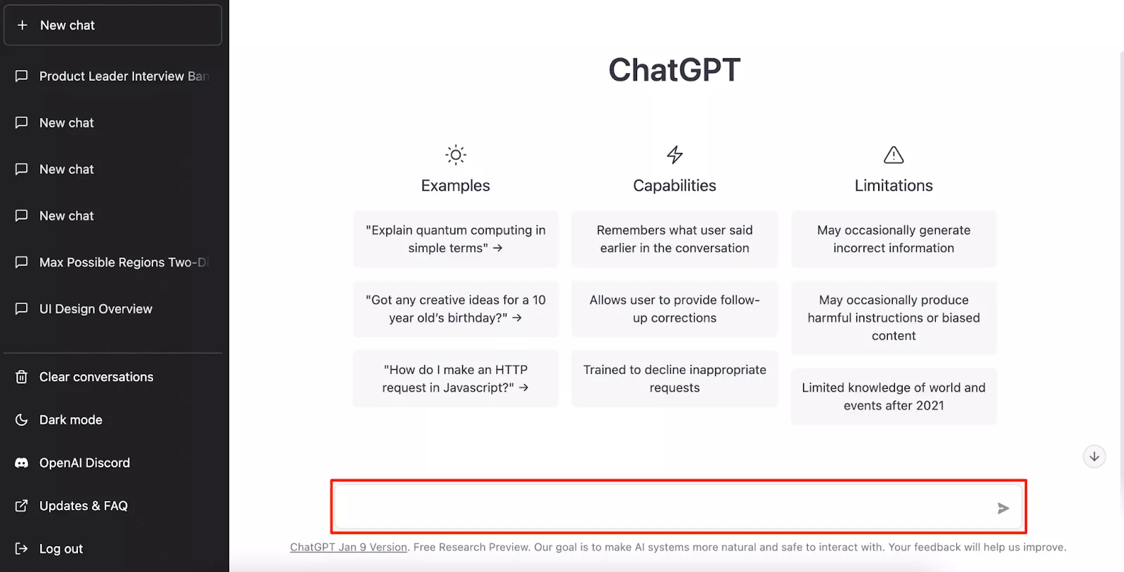 - 您現在可以開始使用 ChatGPT。只需在屏幕底部的聊天框中輸入您的請求,然後單擊發送圖示