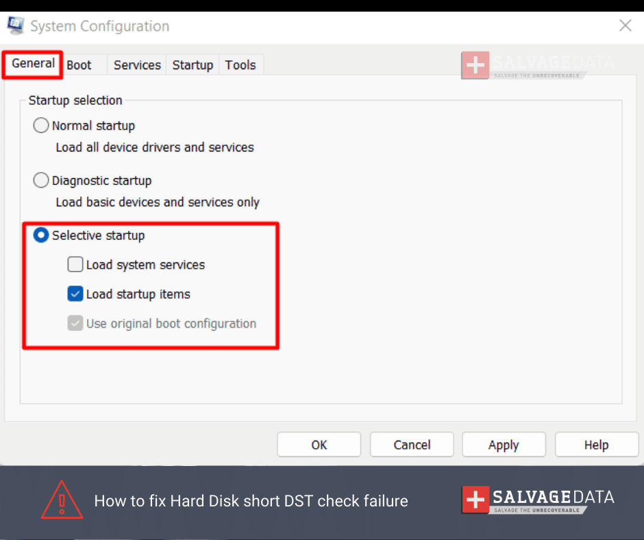 - 在系統配置窗口中,轉到常規選項卡並選擇選擇性啟動。