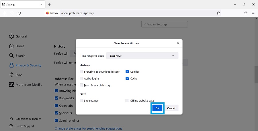 5. 選擇首選時間範圍,勾選“緩存”和“Cookies”複選框,然後單擊“確定”確認刪除。