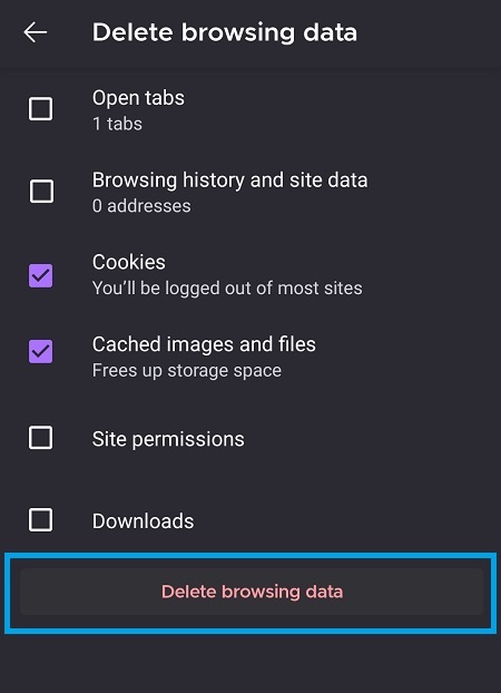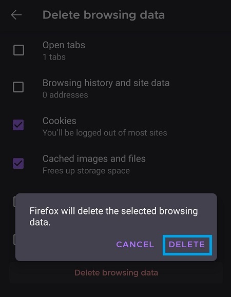 5. 單擊“刪除”以清除您的緩存和 cookie 數據。