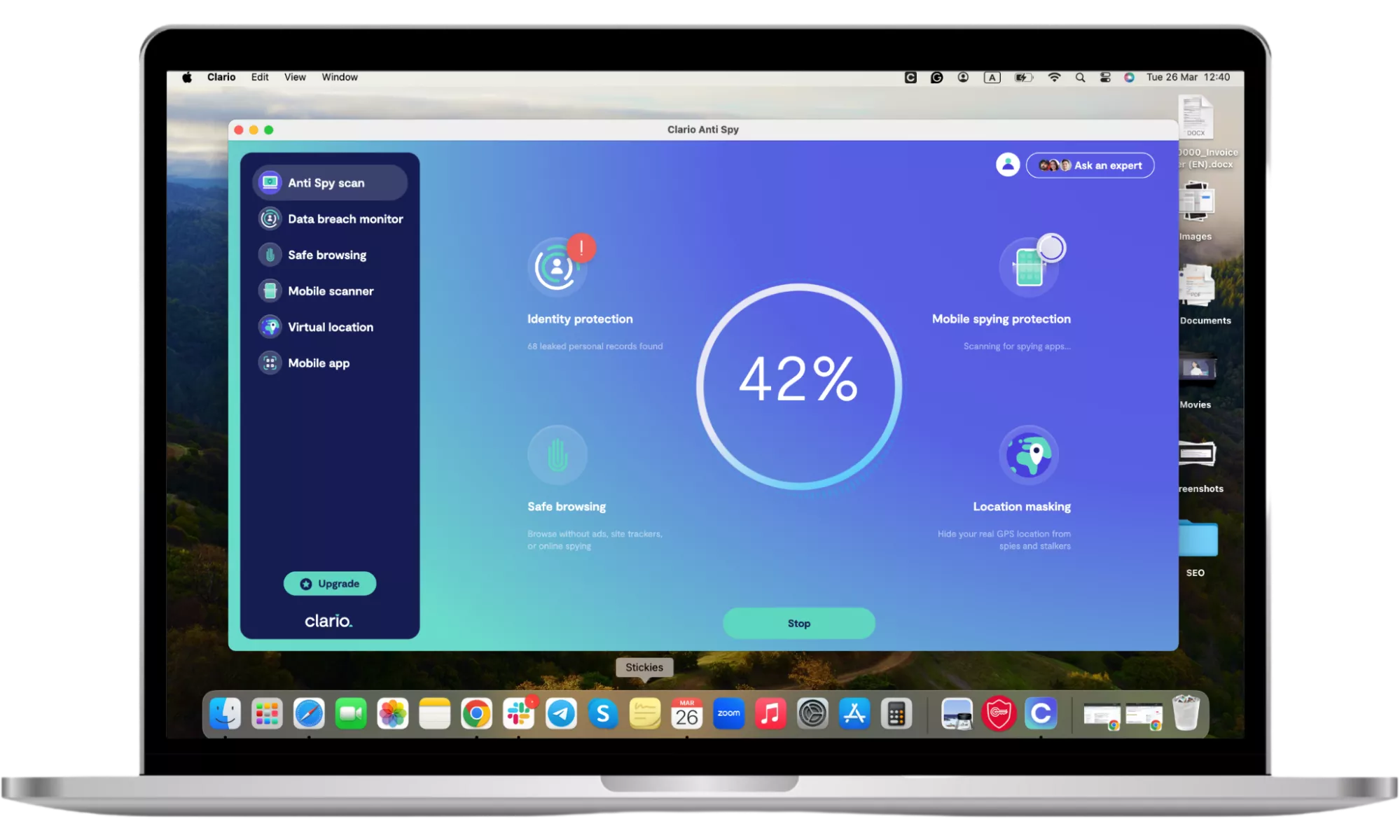 又一個重要的一步你可以採取以下措施來阻止你的前任監視你的 MacBook:在您的設備上使用反間諜軟件應用程序。Clario 的反間諜同類應用幫助保護您的虛擬內容來自你的侵略性前任。該應用程序將掃描設備上安裝的間諜軟件並刪除可能不需要的應用程序,阻止你的前任。