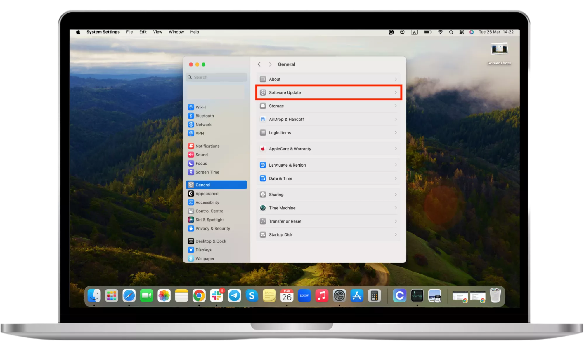 - 在側面菜單中,選擇一般的然後單擊軟件更新。