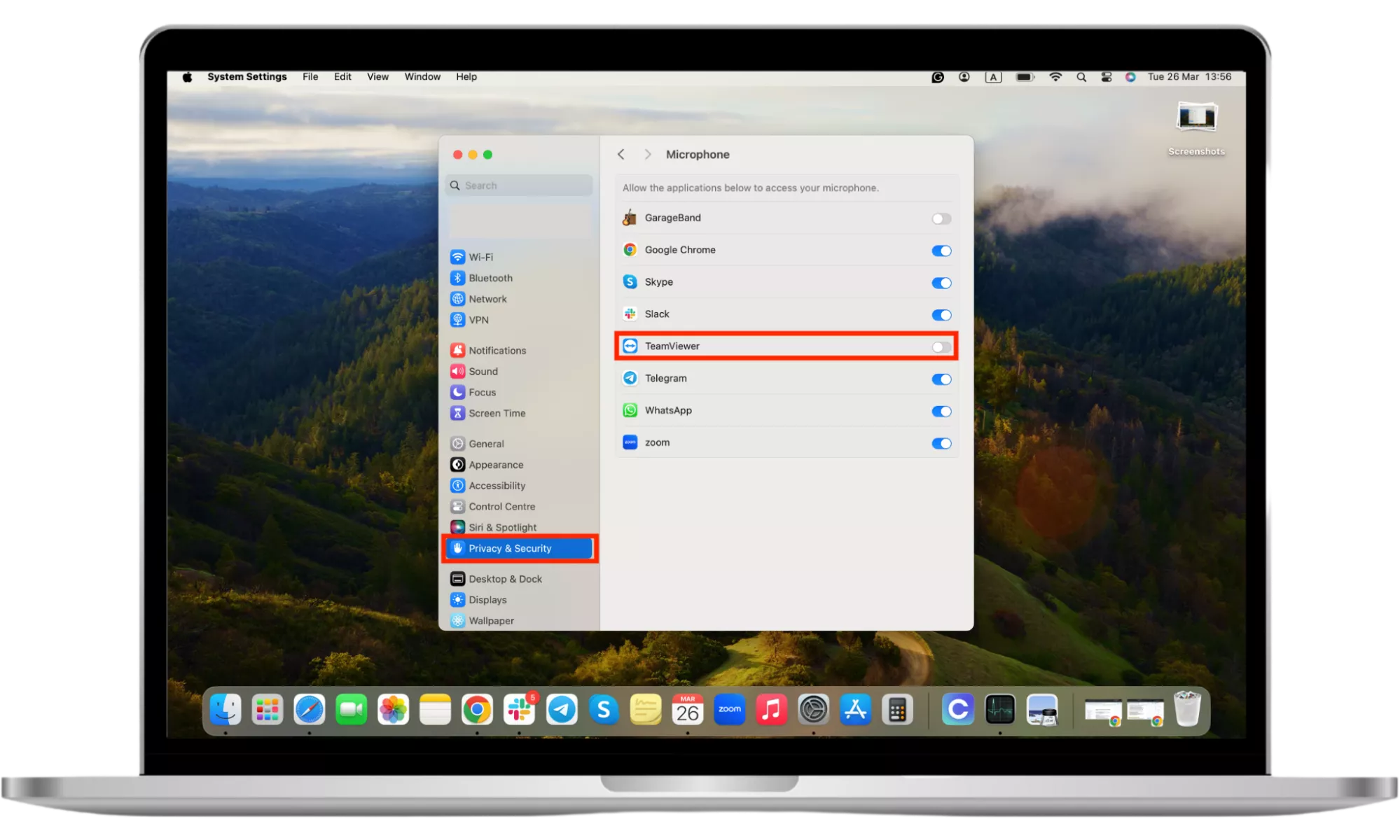 - 選擇隱私與安全從左側菜單中關閉您不想訪問 MacBook 麥克風的應用程序或您不記得下載過的應用程序。