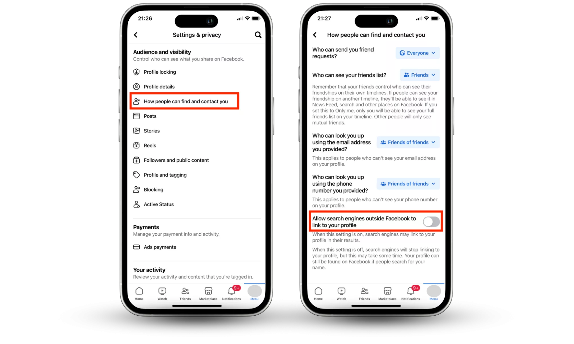 - 關閉允許 Facebook 之外的搜索引擎鏈接到您的個人資料。您還可以自定義人們查找您的 Facebook 帳戶的方式。