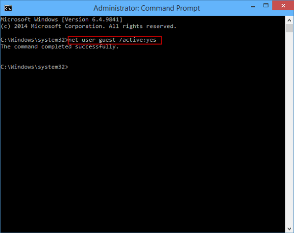 步驟2:要啟用此帳戶,請輸入“網絡用戶訪客/活動:是”(不帶引號)並按進入。