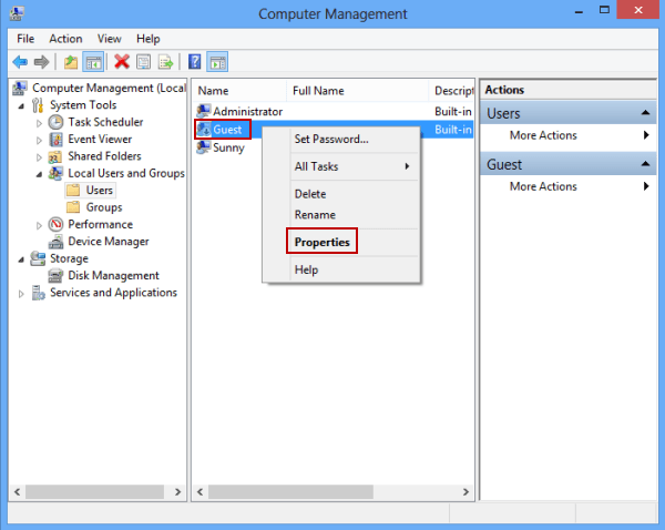 步驟3:右鍵單擊客人右邊的帳戶並選擇特性在上下文菜單中。