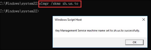 第4步:複製及貼上 "slmgr /skms zh.us.to”並按進入,您將看到一個彈出窗口,如下所示。