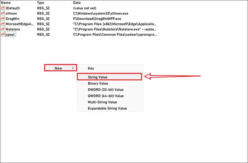 步驟3右鍵單擊空白處,選擇“新建”->“字符串值”,並以軟件命名。