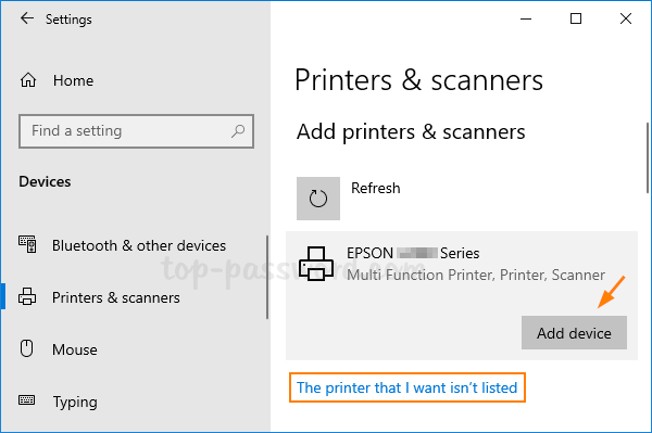 如果檢測到您的打印機,請選擇它並單擊添加設備。 Windows 10 將自動下載並安裝打印機驅動程序。只需等待它完成即可。