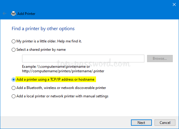 彈出嚮導會為您提供不同選項的列表,以幫助您找到打印機。我建議您選擇“使用 TCP/IP 地址或主機名添加打印機“ 選項。