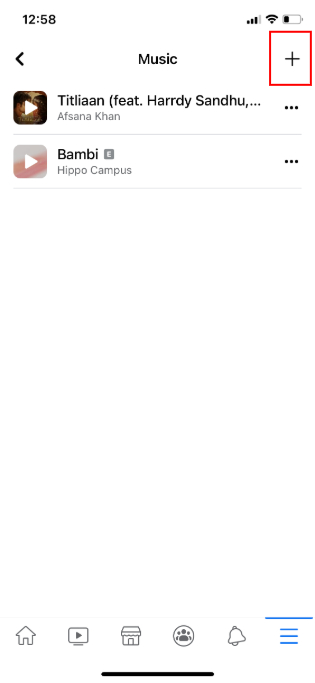 - 點擊 Facebook 音樂頁面右上角的 + 圖標。