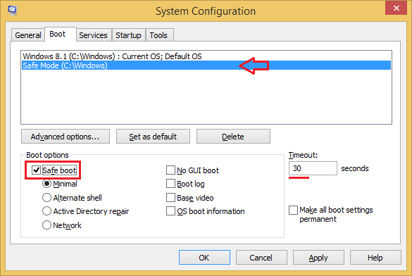 - 在系統配置窗口中,單擊引導選項卡,從列表中選擇新創建的啟動輸入“安全模式”。檢查標有標籤的框安全引導(在啟動選項下),並設置暫停到30秒。