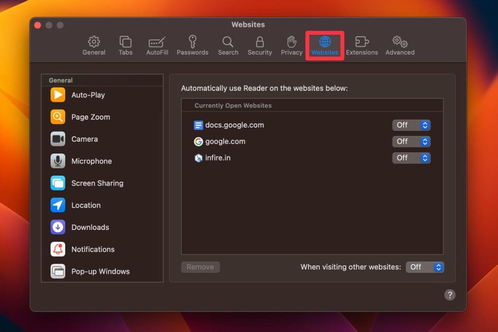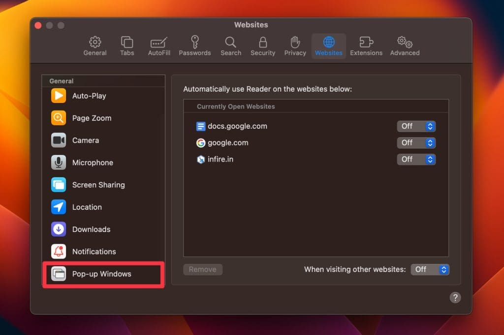 現在,當您打開這個特定網站時,Safari 將不會阻止彈出窗口。
