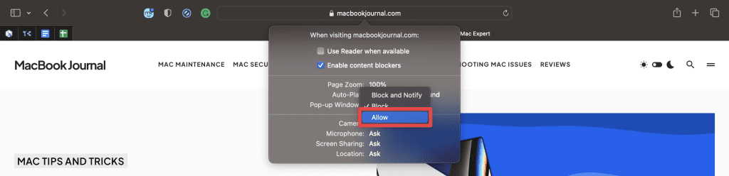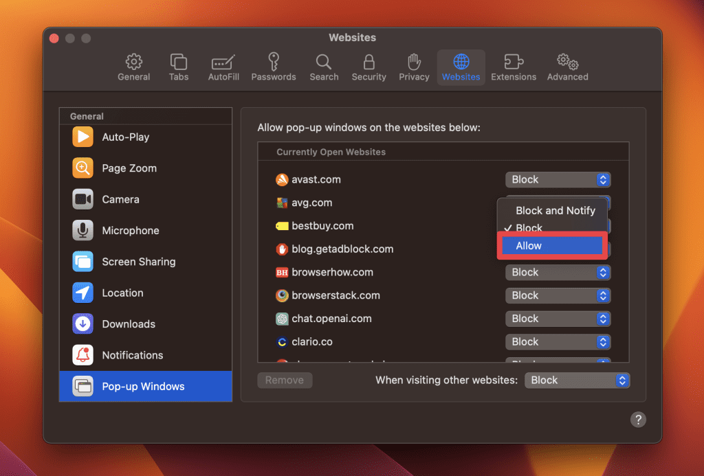 - 在右下角,單擊旁邊的下拉菜單訪問其他網站時並選擇允許。