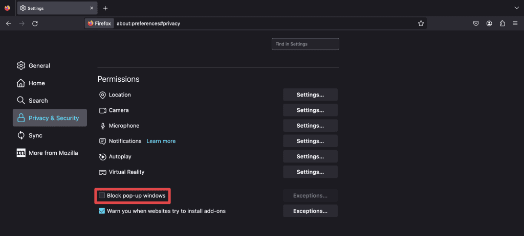 - 向下滾動到權限部分並取消選中阻止彈出窗口。