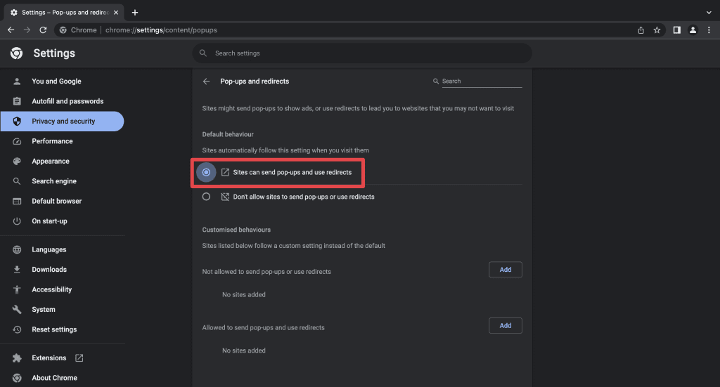- 在站點設置中,單擊彈出窗口和重定向。您可能需要向下滾動。