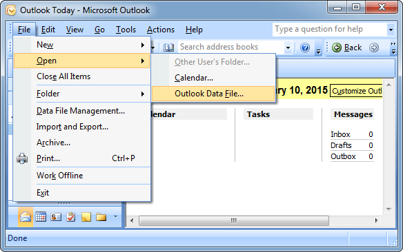 - 在 Outlook 應用程序中,單擊文件菜單。導航至打開子菜單,然後單擊Outlook 數據文件。