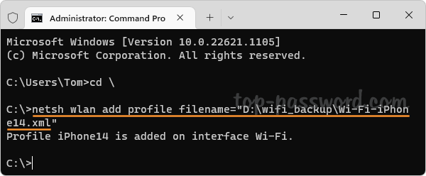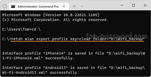 D:\wifi_backup” 與要存儲備份的現有文件夾位置。netsh wlan export profile key=clear folder="D:\wifi_backup"