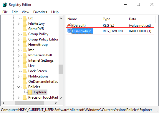 - 將新創建的條目重命名為禁止運行,並將其值設置為1。