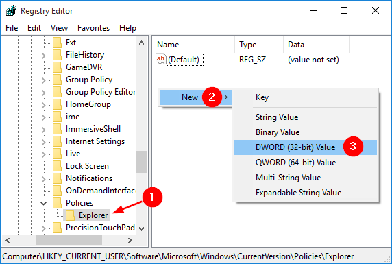 HKEY_CURRENT_USER\Software\Microsoft\Windows\CurrentVersion\Policies - 在左側窗格中,右鍵單擊政策,然後選擇新的->鑰匙,輸入探險家並按 Enter 鍵。如果探險家key已經存在,跳過這一步。