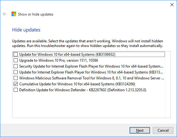 - 現在您可以看到適用於您的系統的所有更新。檢查您想要阻止安裝的更新,然後單擊下一個。