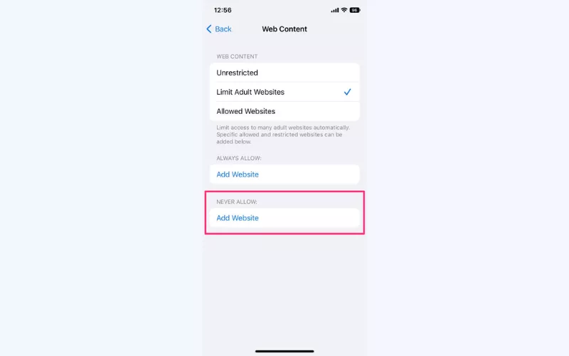 請注意,如果您選擇限製成人網站模式下,您還可以將更多網站添加到限制列表中。只要找到絕不允許選項並手動添加不需要的 URL: