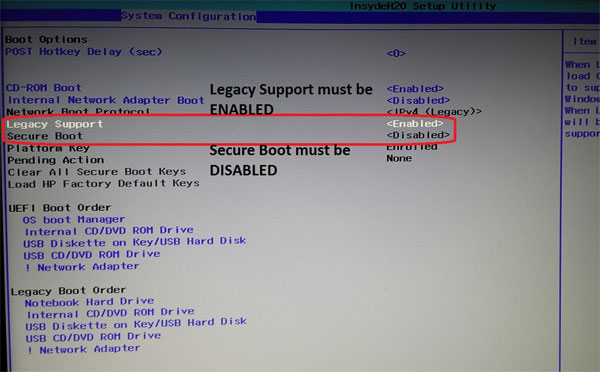- 將“安全啟動”設置為“禁用”,並將“傳統支持”設置為“啟用”。按 F10 保存更改並退出 BIOS。