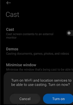 然後在您的 Android 智能手機上啟用截屏功能。前往設定->連接與共享->投擲(將屏幕內容投射到外部顯示器)->打開。
