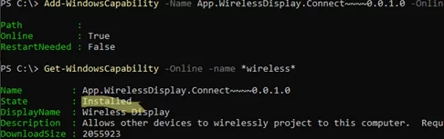 Add-WindowsCapability -Name App.WirelessDisplay.Connect~~~~0.0.1.0 -Online