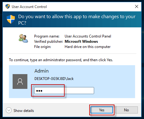 2)Windows 10將彈出用戶帳戶控制對話要索取行政權利。輸入管理員密碼;如果管理員沒有密碼,只需將密碼字段留空,然後單擊是的。