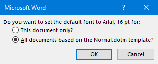 在下一個詢問要設置哪個默認值的對話框中,選擇“所有基於Normal.dotm模板的文檔”並點擊好的確認您的更改。