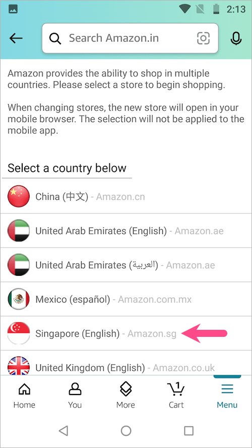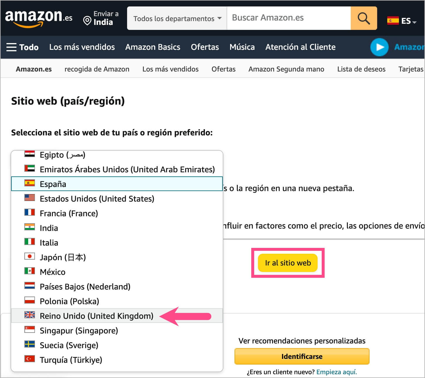 3.改變國家:當您更改首選國家或地區時,亞馬遜會自動切換到相應的語言。例如,將國家/地區從印度更改為西班牙會將您重定向到 Amazon.es,並且語言將設置為西班牙語。