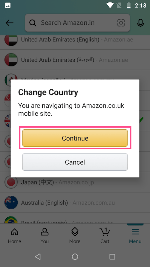 - 點擊“繼續”繼續。現在,您所需語言的新商店將在您的移動瀏覽器中打開。筆記:與 iPhone 應用程序不同,更改不會應用於移動應用程序。