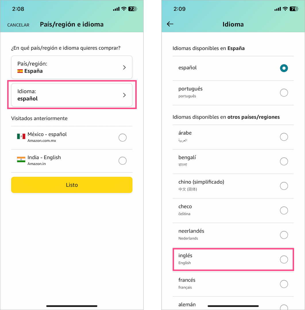 按照以下步驟將亞馬遜應用程序上的語言從西班牙語更改為英語。