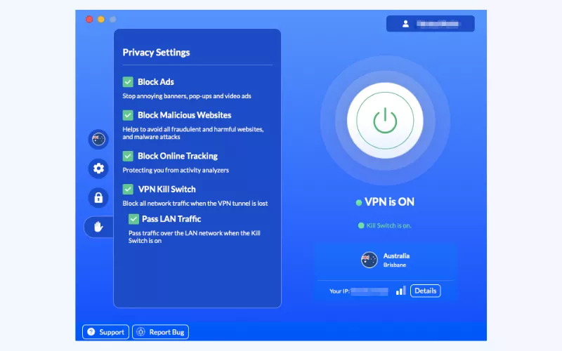 - 設置隱私和安全設置。您可以選擇使用最合適的VPN協議、打開Kill Switch、攔截廣告以及啟用更多有用的功能。