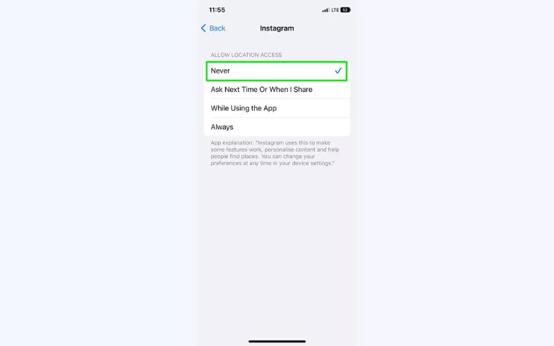 - 選擇您的首選選項(如果您想阻止應用程序跟踪您的位置,請選擇絕不對於 iOS 或不允許對於安卓)。