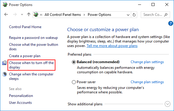 - 從左側的設置中選擇選擇何時關閉顯示屏。