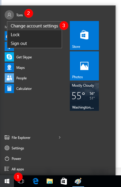 - 右鍵單擊“開始”菜單左上角的帳戶圖片,然後選擇“更改帳戶設置“。如果顯示“開始”屏幕,請右鍵單擊“開始”屏幕右上角的帳戶圖片,然後選擇“更改賬戶圖片“ 選項。